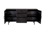 Het dressoir met een minimalistisch, modern ontwerp heeft een volledig zwarte afwerking voor een strak en egaal uiterlijk gemaakt van mangohout.  Het symmetrische design blijft behouden, met drie laden in het midden en twee deurtjes aan beide zijden. Het stalen frame is ook volledig zwart afgewerkt, wat een naadloze en eigentijdse uitstraling geeft. De drie laden bieden voldoende opbergruimte voor het organiseren van spullen, terwijl de deurtjes toegang geven tot extra opbergvakken. Het stalen frame geeft het dressoir stabiliteit en duurzaamheid, terwijl het een eigentijdse en industriële uitstraling toevoegt.