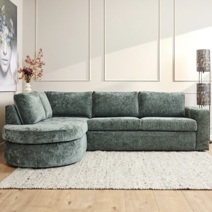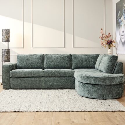 Ontdek de luxe en comfort van de MySofa Alma, een stijlvolle bank van 2,5 zits met een afgeronde divan aan de afgeschermd. Kenmerkend zijn de zachte, ronde hoeken die de Alma een uitnodigende sfeer geven. Deze bank is bekleed met de hoogwaardige Stof Trenza 21 in een elegante groene tint, gemaakt van 100% polyester.