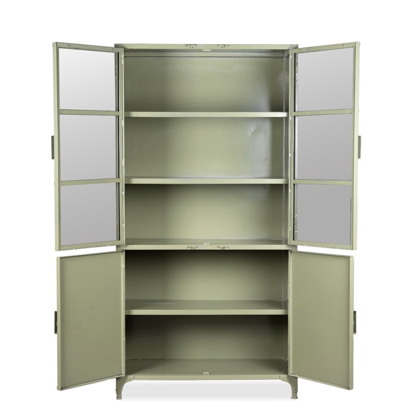 Deze vitrinekast met 4 deuren en een afmeting van 95cm breed, 45cm diep en 185cm hoog heeft veel opbergruimte dankzij de 2 metalen legplanken achter 2 deuren die voorzien zijn van glas, ook achter de dichte deuren bevindt zich nog een legplank. Verkrijgbaar in 4 kleuren, te weten zwart, olijf groen, terra bruin en zand creme.